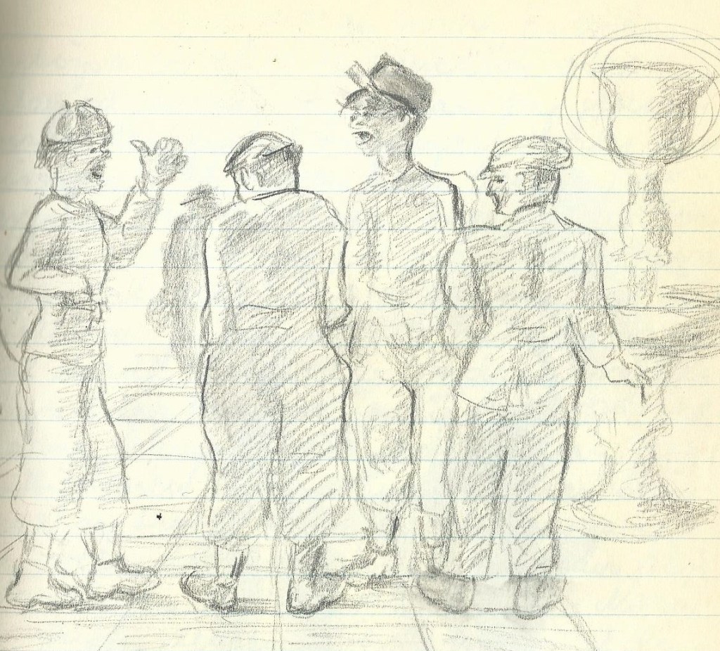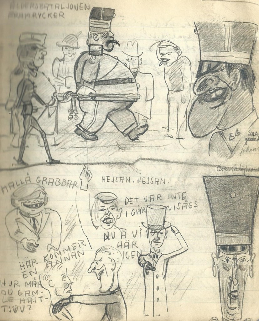 Under exercisen är vi indelade i 4 grupper. Jag tillhör första, vars ledare är furir Mårtensson- liksom Heneskog tydligen också ”bondpojk”. I varje fall utstrålar rustik redbarhet med sina arbetande käkmuskler, sin raka, naggade brunnacke, med sina utspretande armar och lätt skrevande ben. En tredje furir- den här veckans dagkorpral- Tjäder är mörklagd, brunögd, med skäggstubbskuggning runt läpparna och hakan- busig kille säger tredje gruppen. Den fjärde- Gromer- har inte lämnat något intryck.