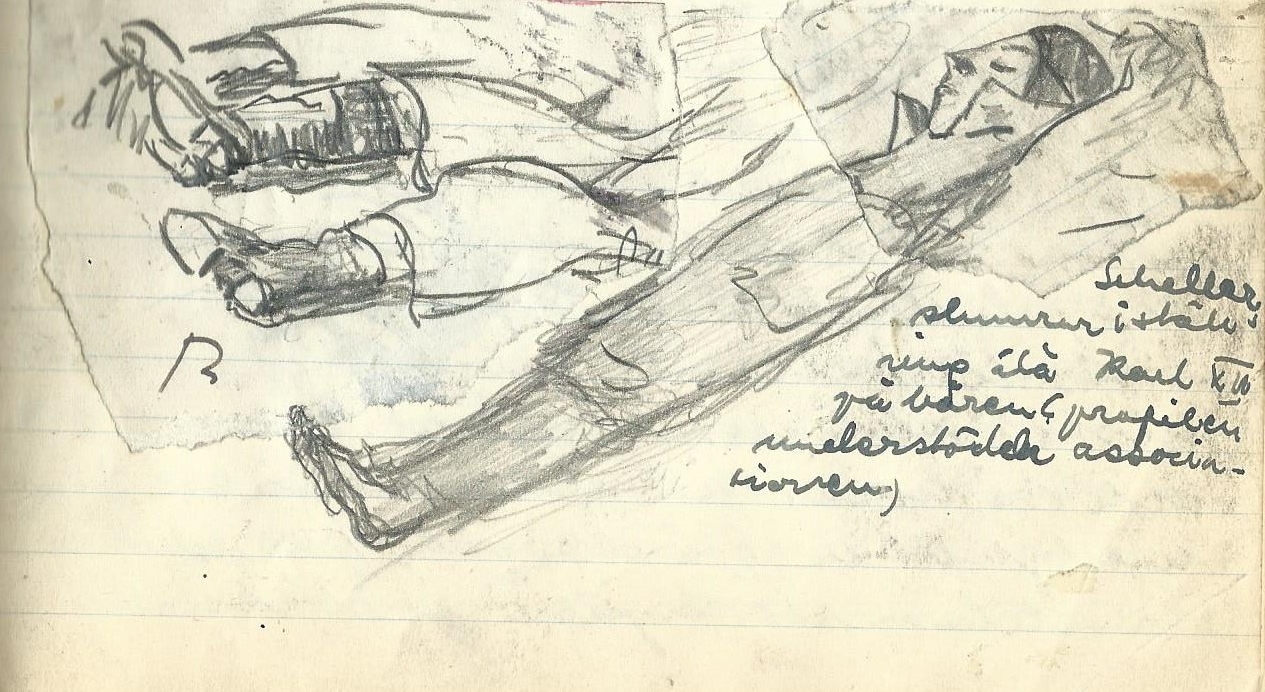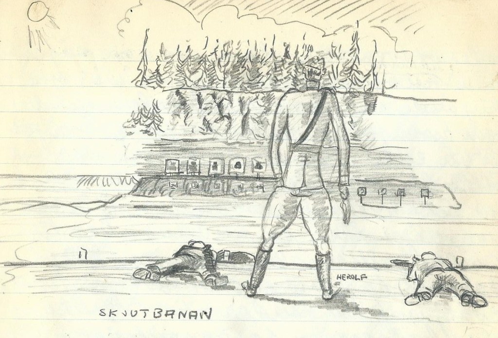 Det psykiska motståndet är för stort: tankarna fladdra åt alla håll åtminstone är den ofta fjärran från Jörnes instruktioner (tanklöshetsslummern med blicken på strået eller lillfingernageln). Det kan väl kvitta om den här tomkvarnen som inget vatten och ingen vind driver mal med eller utan mitt understöd. Högst fyra fem gånger har jag under övningar råkat, snudda vid krigstanken, att man går i krigets elementarskola. Kriget förverkligat glömmer nog enskild ställning och för fot gevär. Enskild ställning intar man lämpligen under kistlocket. ”Nån mening ska det vara med allting.”
