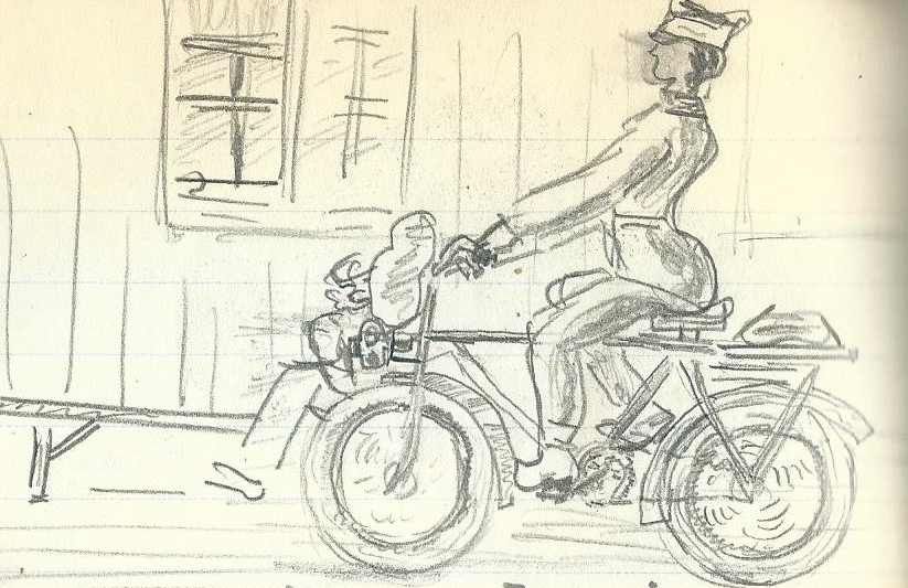 Måndag. Jag hade bara en permis mund- mögonalen- över vilodagen så utrustningen tog morgontimmarna. Den vanliga bleck- och läderbråten. En vindögd korpral lassade på mig och prickade av i rullan. Två fåniga malajer släpade det jag inte orkade till kabyssen. Beklämningen övergick i ”magvånda när jag skulle anmäla mig för Kihlhagen”. Jag förstår att löjtnanten är besviken men jag rår inte för att jag kom hit ”vad säjer han då. Det blev ett snålt och intresserat mottagande. Han kisade både med mun och ögonen när han tog mig i översyn. Han såg ut att få tandvärk av den anblicken. Hur. Ja. Nu känner jag igen korpralen. Har ni fått er utrustning. Ha, gå, då ut till övningarna. Den enkla människan tänkte: han kunde väl ha rest sig och hälsat på en gammal yrkesbroder. Men jag var glad innerst inne att audiensen blev så pass kort. Jag hade svårt med svaromålet och klackarna ville inte gå ihop. Tafatta bugningar och en mössa som skiftades mellan händerna. Hm. Ja.