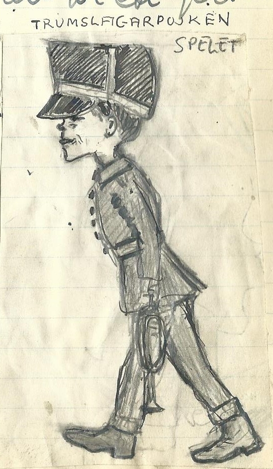 Första dagen födings- och longör tristess är lyckligtvis över. Väntetiden försökte man iakttaga men slöheten tog ideligen överhanden och själen sjönk ner i läderbottnarna. Man beklagade både den ensamma efterblivna och den som gav honom separatlektion i ”för fot gevär” och ” i remmen gevär”. Den nye löjtnanten eldade på, spatserade, tittade på skolpojkarna, rätade upp sig och röt. Två fanjunkare gamlingar skrattade vid kanslidörrn. ”Den du!”- ”ja, det var en jäkel” (skrivet log 4. Tisdagen den 20. 6)