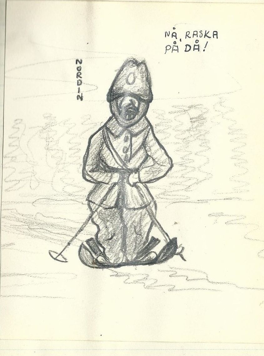 Jag har inte åkt på tie år. Då skakade fänriken på huvet och stampade i snön. Ovanan vid bössknallen gick med andra salvan och sen var man klar för det blåfruset tafatta protokollet. I en vitpäls upptäckte jag strax Bogrens lilla barnansikte. Bogren 40, sedermera tross chef på 72, en intelligent och lugnt beställsam specerihandlare. Nu vpl. Furir. Dessutom femåringskinder, denna flickmun, en svensk soldat i toppklass ändå. kedja förmedlade order upp till markörerna: Det måste vara jäkligt å markera nu, fingrarna fryser väl fast på slädarna däruppe.