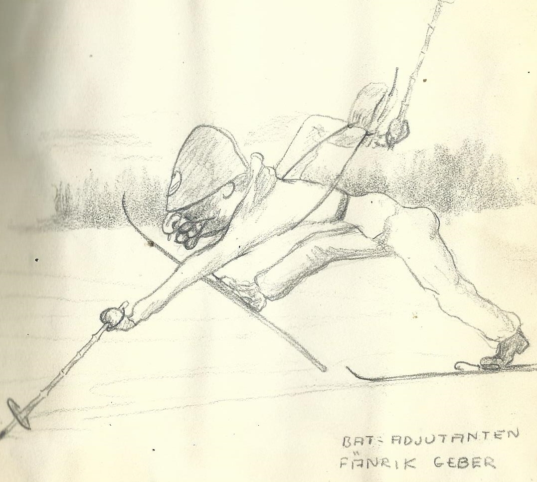 ”Du ska inte skämma bort pojka. Du vet di är rekryter än” manade Bogren förtroligt när jag samlat upp papperet efter skjutningen. Jag var ängslig för störtloppet men det visade sig att jag hade bättre balans än många av de meniga som redan hunnit träna in skidans grundelement. Hade bara snön förekommit rikligare så hade jag tagit sluttningen i ett svep. Jag gladde mig åt denna upptäckt och fräste en smula fräckt nu mellan trådstolparna och över en nedpressad taggtråd. Häsjöstilen var jag bekant med genom tidningarna och den tycktes passa mig bra. Jag är tillräckligt stark i låren för den och glidet smög sig fram ur kroppsvinklen. Det skulle vara roligt om jag fine tillfälle att skaffa mig rutin som rännare. Ett par lätta terrängskidor av min egen längd skulle väl göra övningarna åtskilligt, njutbarare. De här gamla 15 mila- rakorna tillåta mig en forcering att tala om. I täten lopp fänriken undan med mjuka stavhugg. Käpparna pendlade så vackert och obesvärat längs spåret. Mina knubbiga störar utförde motsträvigt sitt grovarbete med klent fäste i det snåla väglaget. Men de ingav den osäkre en slags trygghet. De stöttade bra när jag var på väg över styr. Jag tillhörde inte de olyckliga. En av dem kom med skidspetsen i handen likt souveniren av ett flygplansvrak.
