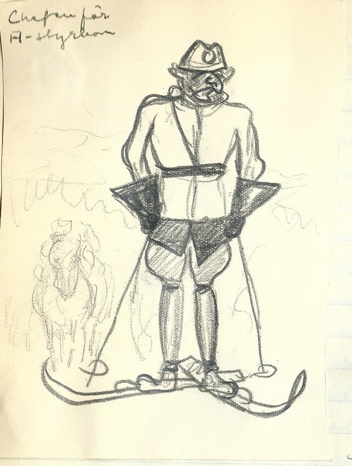 Det blir ett lindande för hr amanuensen i detta år. Tänka sig denne löslemmade säl på ett par skidor. Han skulle tas si snabbare fram på snöskor för at nu inte tala om i vattnet. Som skåning har han en dunkel uppfattning om allt vinterligt. Det är knappt att han vet vad rimfrost är. Han sammanfattade sina känslor inför prövningarna med ett hjärtligt fy faen. Men förslagen som han är så dröjer det nog en eller två dagar innan han övertar sitt befäl.