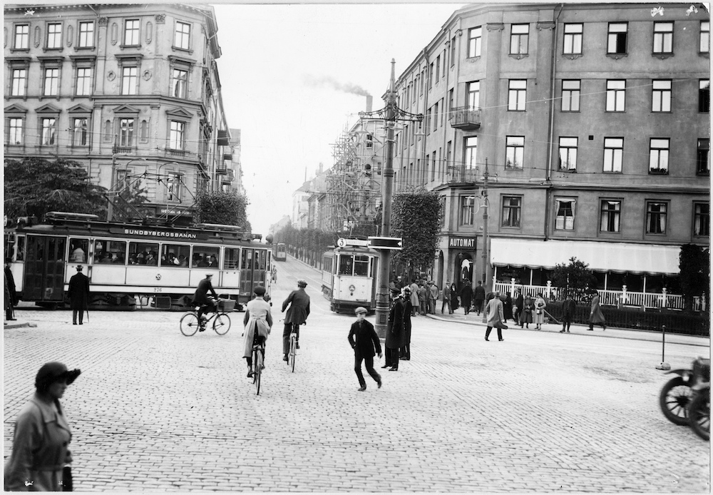 .stången och girar ned i Surbrunnsgatans backe. Det är en besvärlig gata med alla bryggarbilarna som trängs med privatbilar, renhållningsbilar och lastbilar som mödosamt backas in i ett undergroundgarage, någon sorts distribution, på andra sidan Hagagatan. Ett par cykel- och bilverkstäder med reparatörer arbetande en bit utanför trottoarerna ökar förvirringen. Just vid Sveavägen, där jag tar av inåt centrum, uppstår gärna stockning. Men Sveavägsboulevarden fram kan det gå undan trots parkering i dubbla rader tre busslinjer och mycket annat. Bort i fjärran, ett par kvarter på anda sidan Kungsgatan ser jag vackra milda ytor och konturer av gamla halvrivna hus. Den sista innerslingan av tunnelbanan går där fram. Behagligt öppet är det till höger i stadsbibliotekets hörn och restauranten Corso, där folk brukar samlas om sommarkvällarna och lyssna till orkestern, som när det är ljumt flyttar ut i utomhusserveringen. Den groteske centauren avtecknar sig på Observatoriekullens nabb som ett missfoster till kylarknapp. Sedel framifrån är den ännu omöjligare, skev och kraftlös. Men det tänker jag inte på, när jag spänner vadorna över tramporna och lättar förbi Handelshögskolan och de många bilsalongerna på samma sida. Den vänstra är mera småmerkantil. Där finns en blygsam herrekipering, som sköts av en gammal skallig, nästan stendöv gubbe. Dit går jag nu, sedan den fine schackspelaren- klädeshandlaren i vår gatulänga överlåtit sitt krypin till en mera driftig direktörsfigur (den blide åldringen, vars namn tillfälligt suddats bort ur mitt minne var i seklets början Sveriges främste och en av Europas skickligaste schackstrateger, en stormästare enligt nutida gradering. Han yttrade sig med nervöst skarpsinne om de dragföljder tidningarna publicerade från en eller annan mästerskapsturnering) sista stycket till Tunnelgatan bromsades förr upp av den smala mitt i gatan liggande planteringen kring Karl Staafs obeskrivligt fula byst. Där ligger nu asfalten slät. I gengäld har trottoaren vidgats till piazzaliknande rymlighet med cementblomkrukor och soffor vid muren till Adolf Fredriks kyrkogård. Folk behöver inte snubbla över varandra där, vilket de gå utmed Thulehusets väldiga, triviala länga. Ofta då jag kränger mig loss från cykeln vid Fylgias port står Evert Eidfelt och spanar, redan svampig av pilsner fast klockan bara är halvtio.